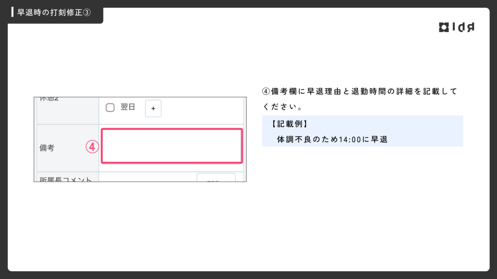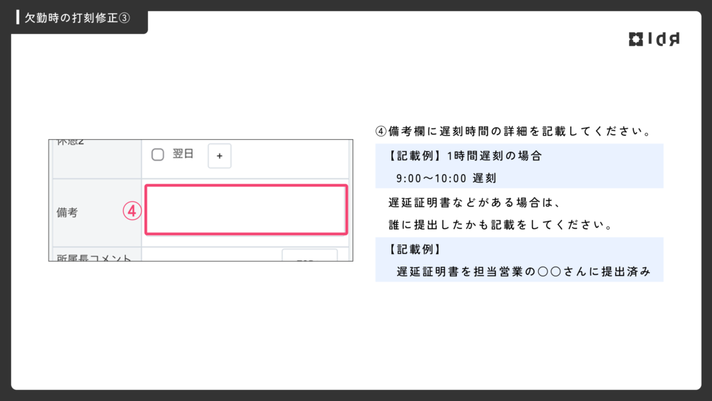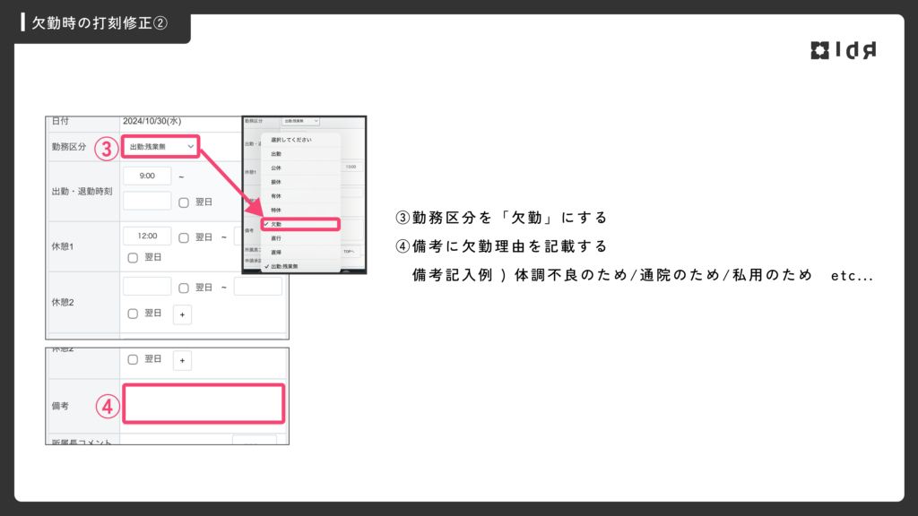 遅刻・早退・欠勤が発生する場合は、以下の対応を行ってください。