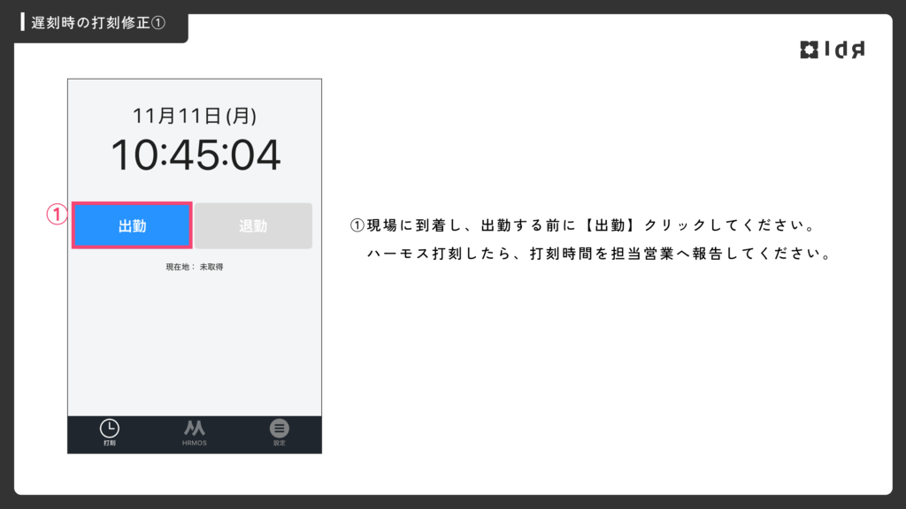 現場到着後、実際の始業開始時刻を担当営業へ報告してください。